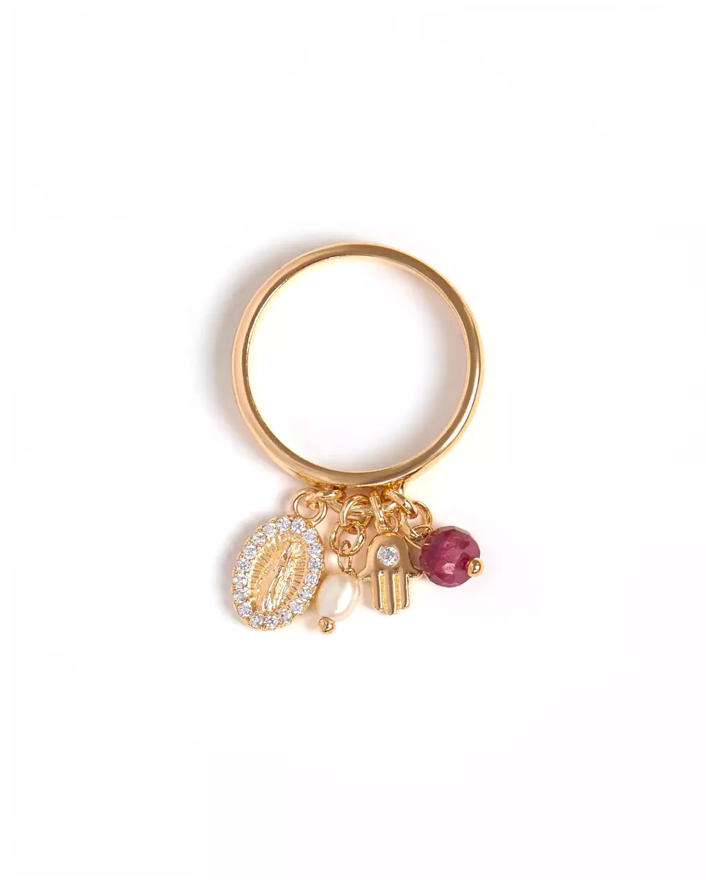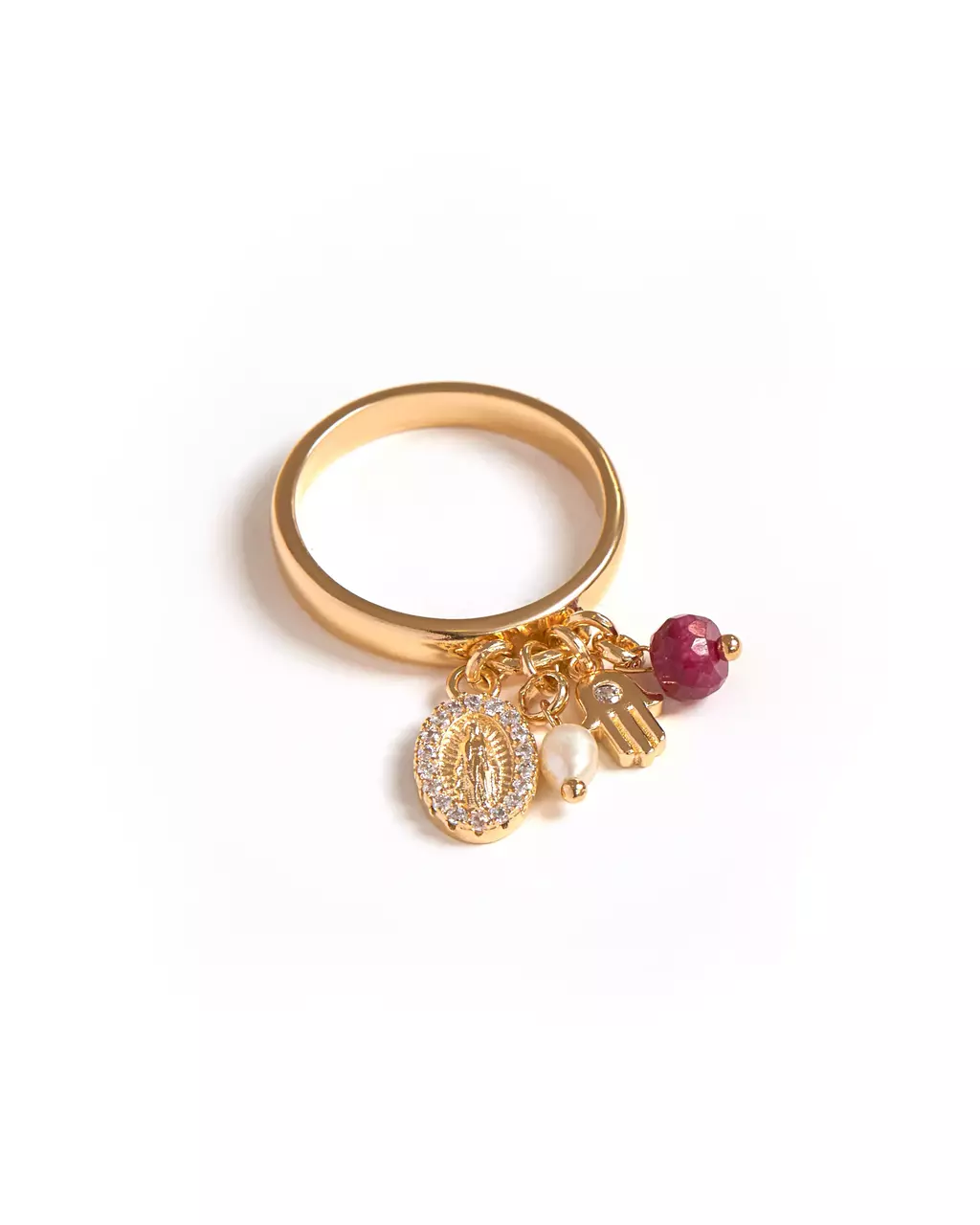 O Anel Dourado com Pingente Cravado, Pérola de Água Doce e Rubi Indiano é uma joia única que une delicadeza e sofisticação.